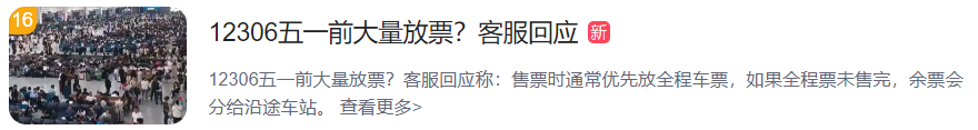 5月1日,话题“12306五一前大量放票?客服回应”冲上热搜。